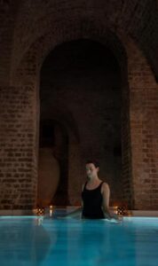 Una vez en el interior del centro, empieza un viaje a través de los sentidos: la tenue luz de las velas, el calmante olor de azahar de Orange Garden, la fragancia relajante de AIRE Ancient Baths, el reconfortante sonido de melodías relajantes que se escuchan incluso debajo del agua y el suave tacto de los aceites corporales sobre la piel. Las experiencias AIRE tienen como piedra angular el agua y sus beneficios para la salud a través de un recorrido por aguas a diferentes temperaturas. Entre sus diferentes baños, los visitantes pueden disfrutar del Caldarium (Baño Caliente), el Frigidarium (Baño Frío), el Tepidarium (Baño Templado), el Balneum (Baño de los Mil Chorros), el Vaporium (Sala de Vapor con Aromaterapia) y el Flotarium (Baño de Agua Salada), ofreciendo un recorrido termal que activa la circulación, libera tensiones y prepara el cuerpo para recibir exclusivos rituales.