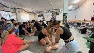 La colaboración con las Escuelas de Verano ha consistido en la donación de productos básicos para la promoción y prevención de la salud durante el verano, tales como protección solar, pulseras antimosquitos, así como otros productos de higiene. Esto se ha complementado con la realización de un taller de primeros auxilios a los monitores de las escuelas, a cargo de las pediatras María José Lirola y Pilar Camacho y el enfermero Javier Espejo, del Hospital Materno-Infantil Quirónsalud Sevilla, con el objetivo de que adquieran una formación básica en caso de que tengan que dar atención inmediata a un enfermo, lesionado o accidentado usando técnicas de reanimación cardiopulmonar, maniobras para actuar ante atragantamientos o maneras de inmovilización y vendaje en caso de roturas o torceduras.