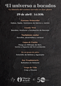 El restaurante María de la O, acoge el 29 de abril ‘El Universo a Bocados’, una experiencia científica y gastronómica en la que los comensales conocerán de primera mano la historia del cosmos contada en siete platos. Cada uno de los siete platos del menú representa una etapa fundamental en la evolución del universo: desde el Big Bang, pasando por la formación de las galaxias, estrellas y planetas, hasta llegar al surgimiento de la vida y la presencia del ser humano en la Tierra.