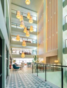 Los seis pisos de altura que acogen el lobby lo hacen un espacio de bienvenida vibrante, único y rebosante de luz natural. Ilmiodesign ha sabido aprovechar la singular arquitectura interior del edificio, con pasillos abiertos al espacio central del lobby, para enfatizar la espectacularidad vertical.