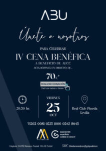 El viernes 25 de octubre, Grupo ABU convoca a todos los sevillanos a su cena benéfica anual a favor de la investigación contra el cáncer. En esta edición, que se celebrará en el Real Club Pineda, se recaudarán fondos que serán destinados a la Asociación Española Contra el Cáncer (AECC).