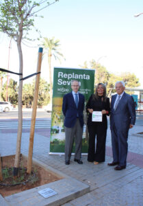 El presidente de la Cámara de Comercio de Sevilla, Francisco Herrero, y la delegada de Arbolado, Parques y Jardines del Ayuntamiento de Sevilla, Evelia Rincón, han participado en el acto de colocación de placas conmemorativas de Replanta Sevilla.