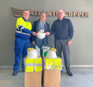 En un acto celebrado en las oficinas de Atlantic Copper, Antonio de la Vega, director general de la Fundación Atlantic Copper, e Ignacio Romero, jefe del Servicio de Prevención de la compañía onubense, han hecho entrega a Antonio González, presidente de la Fundación Valdocco, de un total de 45 equipos de protección individual (EPIS) que incluyen cascos, prendas de alta visibilidad, gafas y un par de guantes. Estos EPIS serán utilizados por los nueve alumnos del proyecto.